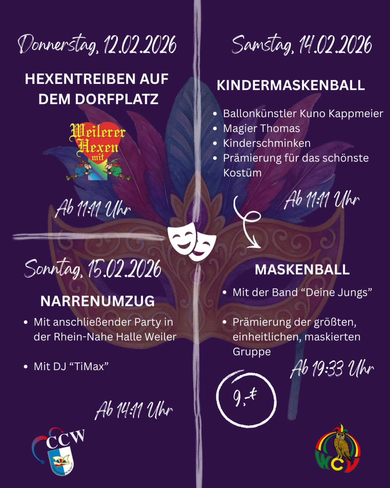 Zusammen mit dem CCW und der Band "Deine Jungs" steigt am 14.02.2026 die Fastnachtsparty in Weiler.